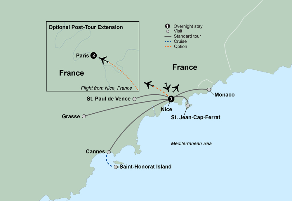 It’s time to live the good life and embark on a getaway to the fabulous French Riviera, or Côte d'Azur. With its elegant coastal resorts, superb eateries, chic boutiques, and captivating museums, it’s the ultimate sunny retreat for the elite. Unpack your bags just once and stay at a single hotel for your entire adventure, which begins with an overnight flight to France.