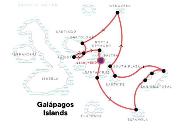 This tour starts at the Baltra Airport. For those arriving to Galapagos today, your flight should arrive to Baltra Island no later than 10:30am. Your CEO will be waiting for you with a G Adventures sign in the arrivals area of the airport. Once you meet the CEO and group at the airport, Staff will send your baggage to the boat directly, you won't have access to your checking baggage until you arrive at the boat around 6 PM and you will start with the first activity.