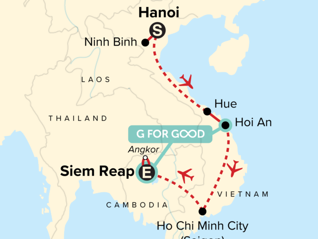 Hop on a bicycle taxi for an action-packed tour of Hanoi and Ho Chi Minh City. Float aboard a bamboo rattan boat in Tam Coc. Visit a tailor to get fitted for a shirt made especially for you in Hoi An. Cook up oodles of noodles at a G Adventures-supported training kitchen. Explore the awe-inspiring ruins of Angkor. Show off your acrobatic skills with a Cambodian circus.