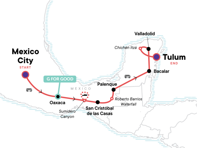 Your Discover Moment: San Cristobal de Las Casas - Free Time, San Cristóbal de Las Casas. Mexico City street food crawl. Alebrijes Artisan Community visit. Boat trip to Sumidero Canyon. Stop at Roberto Barrios Waterfall for a swim. Tour the Mayan ruins in Palenque. A boat adventure into a gorgeous lagoon in Bacalar. Chichen Itzá ruins guided tour. Free time in Mexico City, Oaxaca, Palenque, San Cristóbal de las Casas. All transport between destinations and to/from included activities.